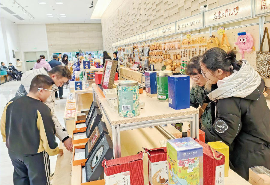 12月1日,在乌鲁木齐市博物馆,家长带着孩子选购各种文创产品。