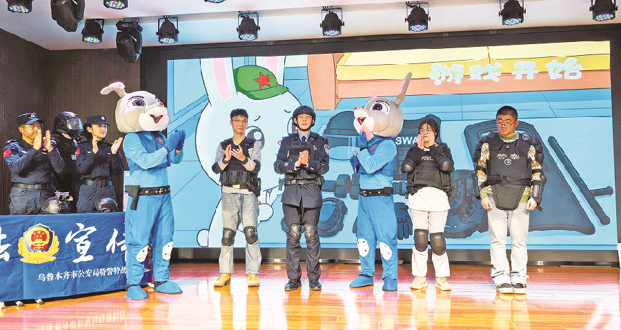 新疆司法警官职业学院志愿者团队带来的情景剧《守护“钱袋子”》,还原“高薪兼职押金陷阱”“刷单返利骗局”等真实案例,让学生们在笑声中学会用宪法法律维护自身权益,提高对“兼职押金”“刷单返利”等诈骗套路的警惕性。在互动环节,学生们踊跃答题,体验特警装备。
