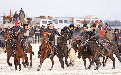 12月14日,雪域草原上农牧民参与刁羊比赛。当日,阿勒泰市切尔克齐乡举办第三届“冰雪骑缘 以梦为马 不负韶华”冬季运动会,来自全乡及周边乡镇的千余名农牧民选手与游客齐聚赛场,共赴一场集体育竞技、民俗展示与文旅融于一体的冬日盛宴。 阿尔达克·拜斯汗 摄