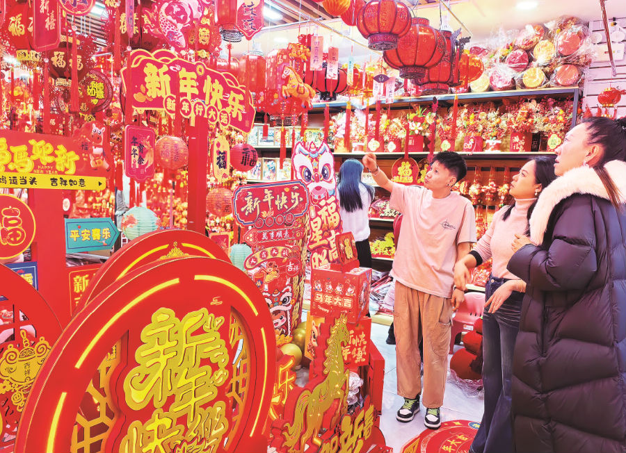 春节临近,乌鲁木齐华凌贸易城年味渐浓,市民们穿梭在各个摊位间,精心挑选春联、灯笼、生肖摆件等新年饰品。融入生肖马元素的文创产品以及各类传统年货备受市民青睐,成为节前消费市场的热门选择。