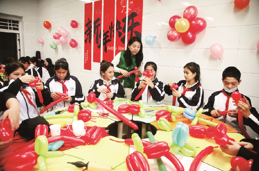 1月16日,学生们在用气球制作“春”字作品。