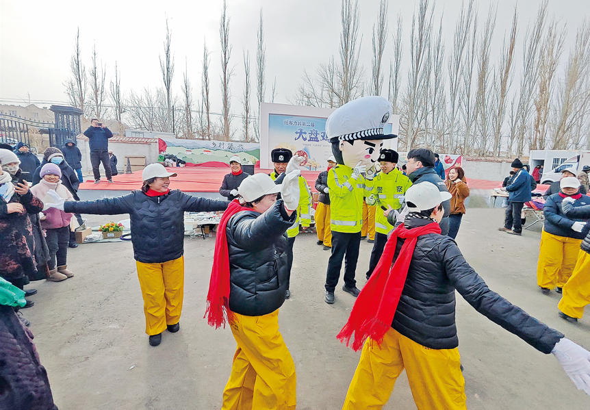 1月30日,在库尔勒市托布力其乡“欢乐大巴扎”,该市公安局交管大队文艺宣传队民辅警与游客共舞。