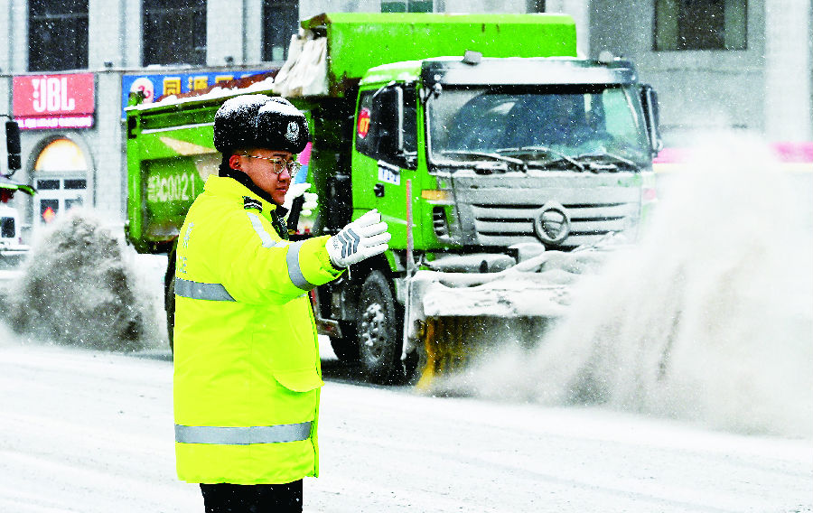 2月24日,乌鲁木齐市公安局交管支队沙区大队友好片区中队辅警在雪中指挥疏导交通。当日,乌鲁木齐迎来降雪天气,乌市公安局交管支队各大队民辅警顶风冒雪坚守一线,全力守护群众出行平安。 石榴云/新疆法治报记者 单坤 摄
