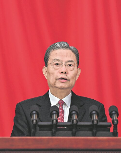 受全国人大常委会委托,赵乐际委员长向大会报告全国人大常委会工作。赵乐际在报告中指出,2025年是很不平凡的一年。一年来,在以习近平同志为核心的党中央坚强领导下,全国人大常委会坚持以习近平新时代中国特色社会主义思想为指导,全面贯彻落实党的二十大和二十届历次全会精神,学习贯彻习近平法治思想、习近平总书记关于坚持和完善人民代表大会制度的重要思想,聚焦建设更加完善的中国特色社会主义法治体系、建设更高水平的社会主义法治国家,紧紧围绕中国式现代化建设依法履职、担当尽责,各方面工作取得新的进展和成效。一是加强宪法实施和监督,维护国家法治统一。常委会两次审议民族团结进步促进法草案并提请本次大会审议,为铸牢中华民族共同体意识夯实法治根基。设立台湾光复纪念日,强化两岸同胞共同民族历史记忆。提高合宪性审查、备案审查工作质量,弘扬宪法精神、社会主义法治精神。二是加强立法工作,以高质量立法服务和保障改革发展。统筹立改废释纂,一年来共审议法律、法律解释、决定草案40件,通过其中24件,包括制定法律6件,修改法律14件等。三是履行监督职责,充分发挥人大监督在党和国家监督体系中的重要作用。共听取审议22个监督工作的报告,检查5件法律实施情况,组织开展2次专题询问、11项专题调研,作出1项决议。四是深化和拓展代表工作,更好发挥人大代表作用。全面贯彻实施新修改的代表法,持续加强代表工作能力建设,紧紧依靠代表做好各项工作,支持和保障代表依法履职。五是发挥人大对外交往特点优势,主动服务国家外交大局。六是全面加强自身建设,不断提高依法履职能力和水平。