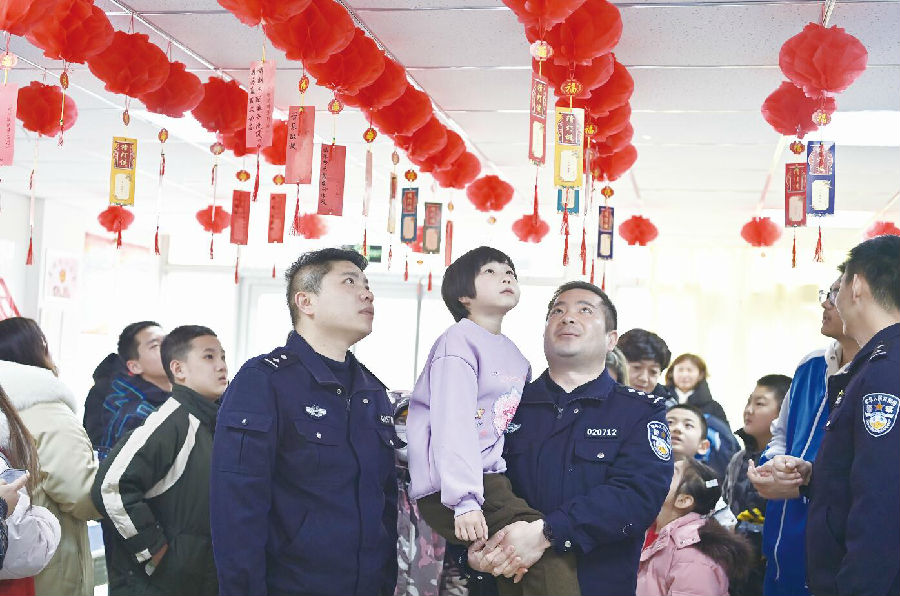 2月21日,乌鲁木齐市公安局沙依巴克区分局红庙子派出所民警抱着小朋友一起看法治灯谜谜面,共同猜灯谜。