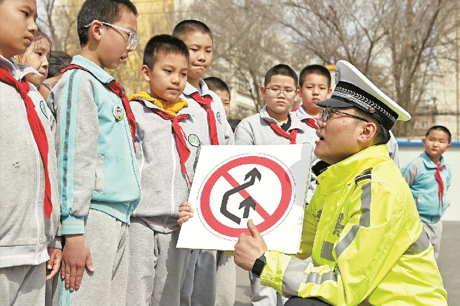 3月25日,乌鲁木齐市公安局交警支队城市快速大队在乌市第八十小学(天汇校区)开展安全教育活动。民警向小学生讲解交通标识的含义。石榴云/新疆法治报记者 单坤 摄