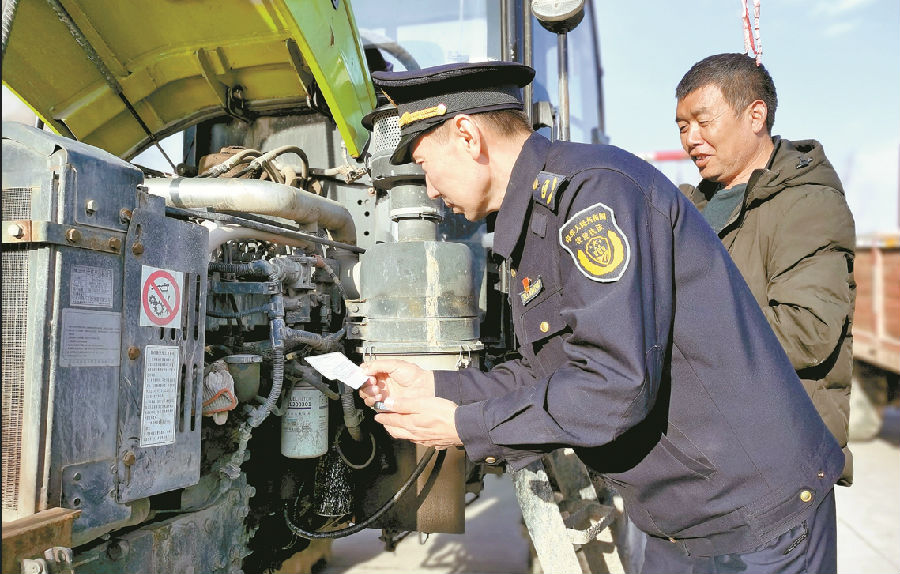 A+ | a3月25日,在沙湾市大泉乡农机检验点,农业综合行政执法人员核对拖拉机登记信息。