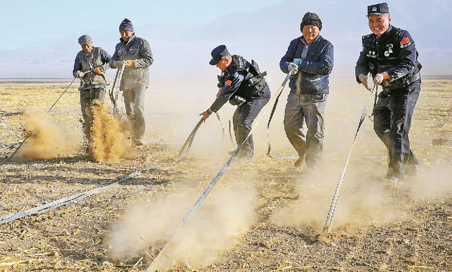 A+ | a3月27日,新疆出入境边防检查总站哈密边境管理支队盐池边境派出所民警帮助辖区种植大户魏向亮清理留在地里的滴灌带。