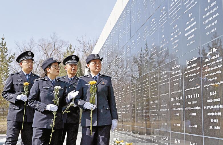 在清明节来临之际,乌鲁木齐市公安局各分局、支队组织民辅警到乌鲁木齐市革命烈士陵园开展祭奠英烈活动。图为3月30日,乌市公安局沙依巴克区分局民辅警在新疆公安英烈墙前重温英烈事迹。