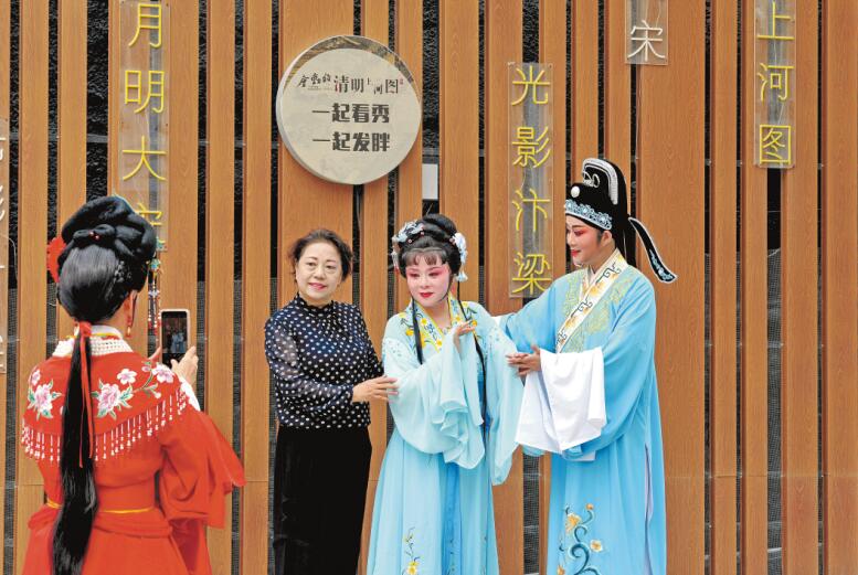 5月14日,游客在乌鲁木齐天山明月城和演员合影。当日,“百年国粹 蝶变传承”新民路“金石榴”杯戏曲文化演出走进天山明月城,演员们为游客送上了一台精彩的越剧演出。