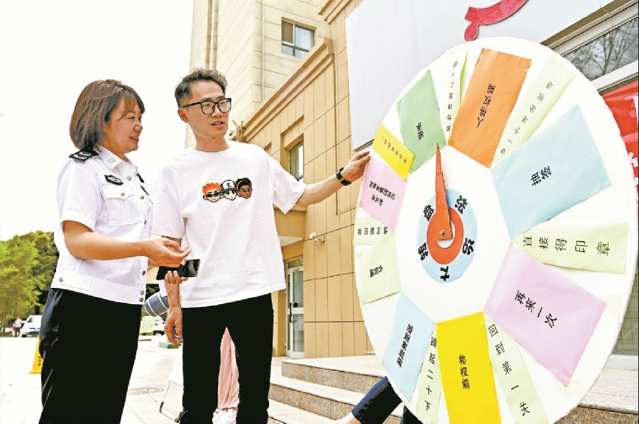 活动中,工作人员通过以案释法、互动答题等方式向群众宣传民法典。石榴云/新疆法治报记者 单坤 摄