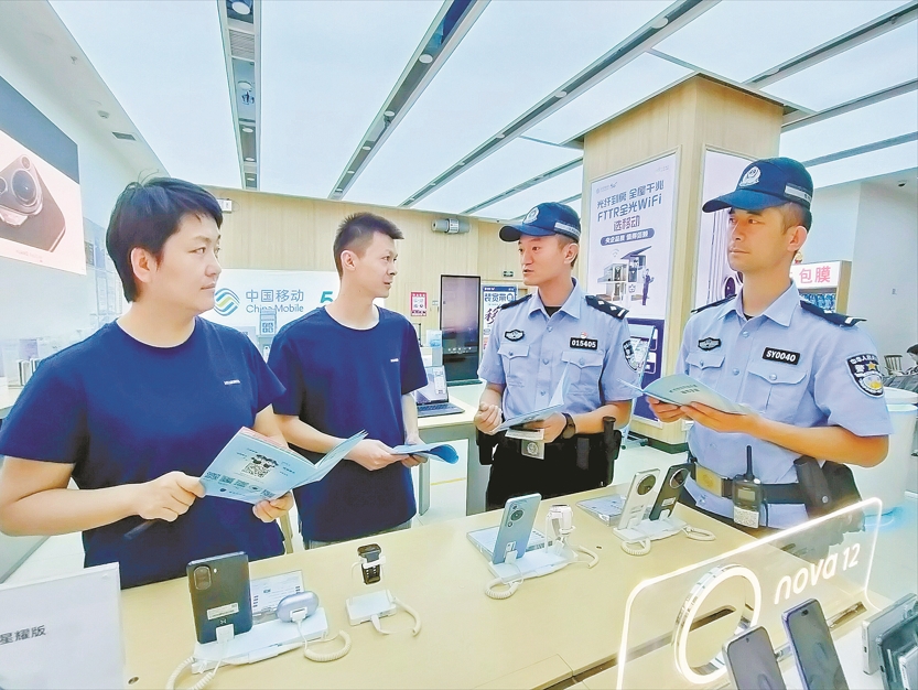 A+ | a7月15日,乌鲁木齐市公安局沙依巴克区分局友好南路派出所友好商圈警务综合服务站站长姜建康(右二)在商场向工作人员讲解如何防止电信网络诈骗。