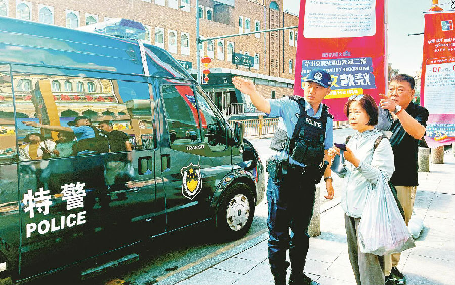 7月20日,乌鲁木齐市公安局特警八支队民警在新疆国际大巴扎为游客指路。