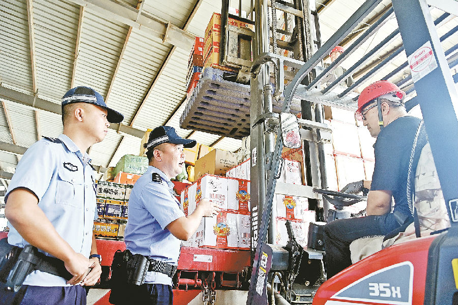 8月13日,民辅警提醒叉车驾驶人装卸货物要注意安全。