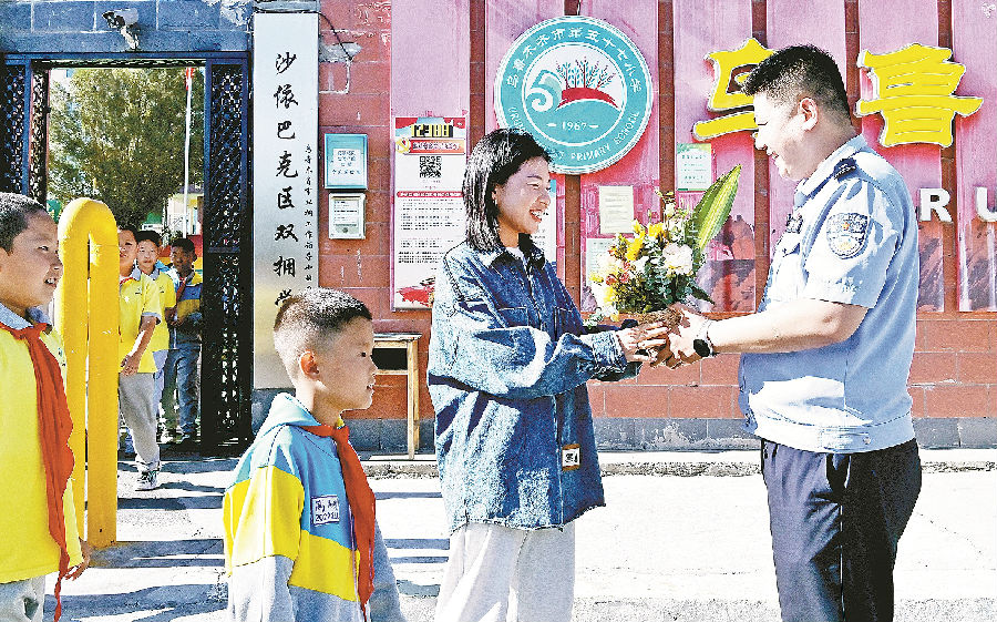 9月9日下午,乌鲁木齐市公安局沙依巴克区分局仓房沟派出所辅警吴昊给当教师的妻子赵红萍送上鲜花。
