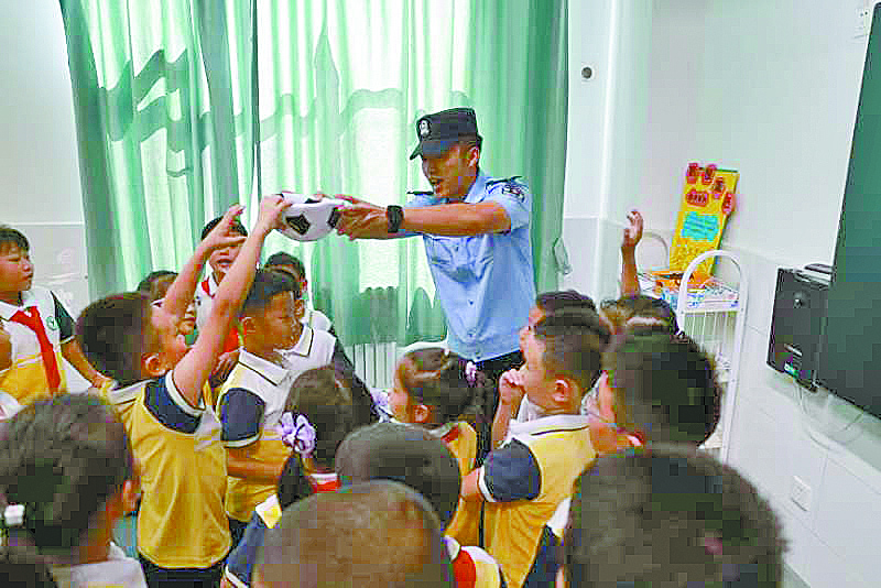 图为民警为答对问题的学生发放小礼品。 朱芯欣 摄