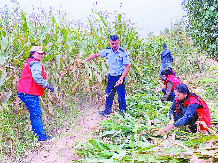 10月13日,伽师县公安局江巴孜派出所仓村警务室民辅警帮助农民收割玉米。