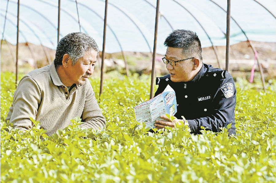 10月25日,乌鲁木齐市公安局米东区分局芦草沟派出所民辅警在人民庄子村二队走访,了解村民的困难诉求,普及防范电信网络诈骗知识,增强村民反诈意识,守好“钱袋子”。 石榴云/新疆法治报记者 单坤 摄