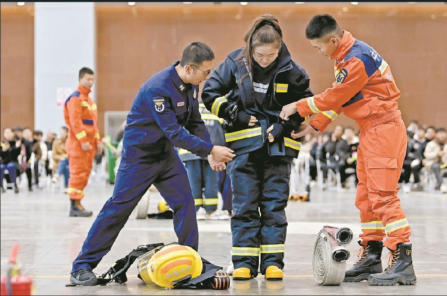 A+ | a11月8日,乌鲁木齐市消防救援支队在新疆国际会展中心举办2024年“119”消防宣传月启动仪式。活动以“全民消防 生命至上”为主题,邀请群众现场参与消防勇士大闯关接力赛、试穿灭火防护服、体验消防救援设备等。其间,防火宣传员结合冬季防火工作向群众宣讲电动自行车充电、燃气使用、冬季用火用电注意事项,讲解火灾逃生和自我防护知识,解答群众提问,让群众在寓教于乐的氛围中掌握消防知识。图为群众试穿灭火防护服。 石榴云/新疆法治报记者 单坤 摄