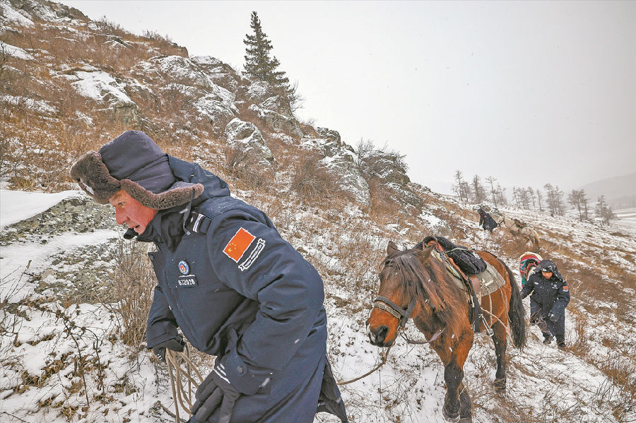 A+ | a连日来,阿勒泰地区部分山区出现连续降雪天气,局部地区出现大到暴雪。11月10日,新疆出入境边防检查总站阿勒泰边境管理支队喀纳斯边境派出所民警对重要山口要道、山林等区域进行实地踏查,确保边境地区安全稳定。图为民警巡查山林地段。 王友波 摄