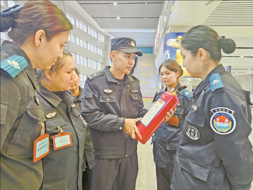 A+ | a连日来,乌鲁木齐铁路公安局奎屯公安处克拉玛依站派出所联合克拉玛依火车站工作人员向铁路职工、旅客宣传消防安全知识,通过消防演练的形式对灭火器、消防栓、消防井等消防设施的使用进行实操培训。图为民警讲解灭火器的用法。 朱芯欣 摄