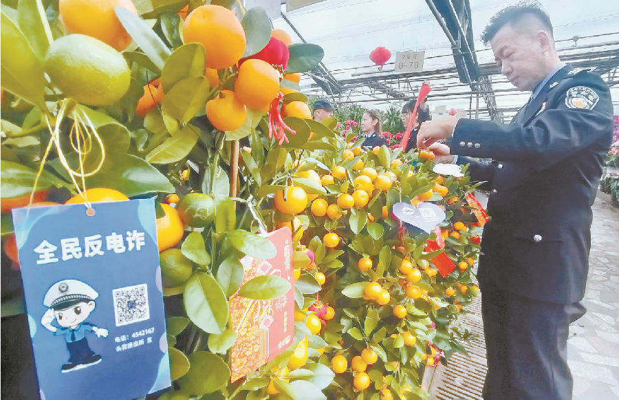 春节即将到来,乌鲁木齐市明珠花卉市场内人头攒动。为进一步增强辖区群众识骗防骗意识,1月22日,乌鲁木齐市公安局沙依巴克区分局头宫派出所民辅警在花市开展“送平安 送春联”预防电信网络诈骗宣传活动。