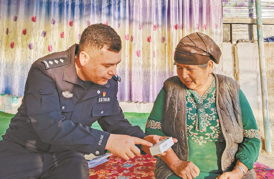 前一天打扫卫生时,月尔姑丽不慎扭伤了腰,疼得厉害,可药店距离她家有7公里。正巧,喀哈尔到月尔姑丽家走访,发现她腰部不适,询问清楚后,叮嘱她多休息便离开了。没想到,喀哈尔第二天就帮她买来了膏药。
