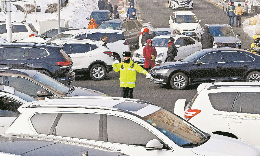 2月12日,乌鲁木齐市公安局交警支队水磨沟区大队河南路中队民警在乌鲁木齐文化中心路段疏导交通。