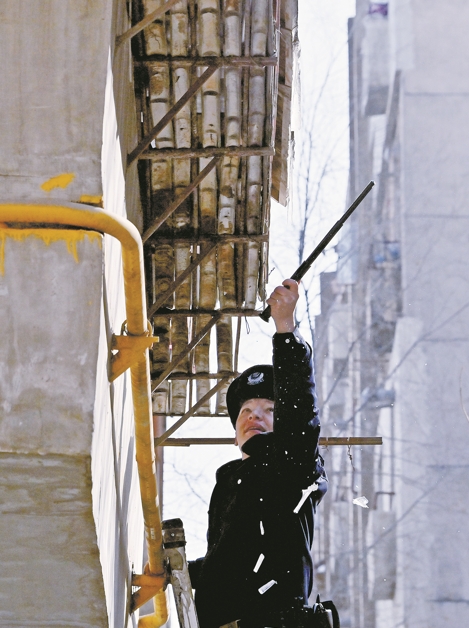 2月26日,乌鲁木齐市公安局沙依巴克区分局扬子江路派出所民辅警在辖区走访时,发现某小区楼体冰锥有坠落迹象,立即敲除冰锥,消除安全隐患。 石榴云/新疆法治报记者 单坤 摄