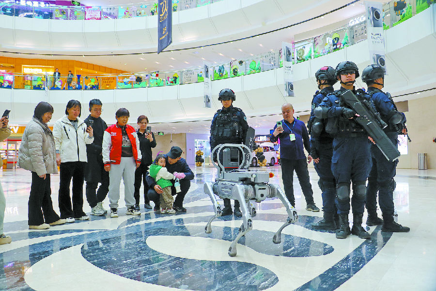 2月27日,库尔勒市公安局民警与警用机器狗一起执勤,引来群众围观、拍照。