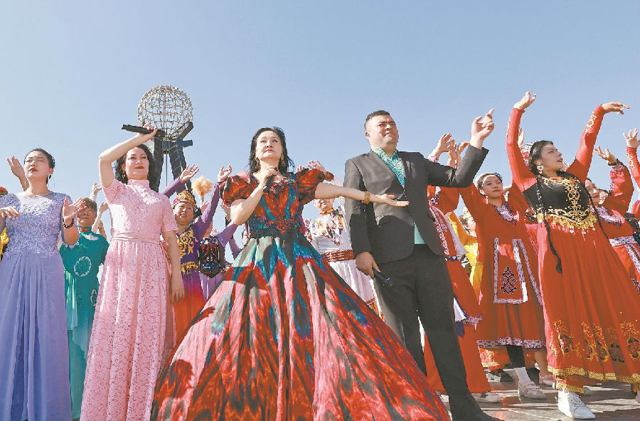 5月17日,演员在位于乌鲁木齐市沙依巴克区永丰镇的亚洲大陆地理中心标志塔景区跳起欢快的舞蹈,欢迎前来游玩的游客。