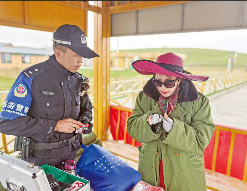 随着旅游旺季到来,巴音布鲁克巴西里格景点的“九曲十八弯”与“天鹅家园”打卡点吸引了大批游客。6月1日,和静县公安局巴音布鲁克派出所分别在这两处热门打卡点设立便民服务点,为游客提供旅游咨询、应急处置、帮扶救助等多项服务。图为便民服务点民警向身体不适的游客提供速效救心丸。 石榴云/新疆法治报记者 韩晋 通讯员 刘英 摄