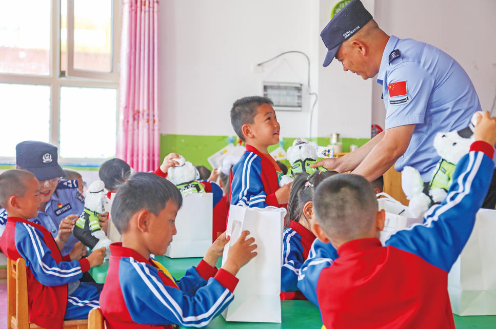 A+ | a7月2日,新疆出入境边防检查总站哈密边境管理支队盐池边境派出所民警走进哈密市伊吾县盐池镇中心幼儿园,为即将放暑假的小朋友们带来一堂暑期安全课。民警重点讲解防溺水、防诈骗等知识,还为小朋友们送上印有派出所电话的警察小熊,让孩子们将“安全”带回家。