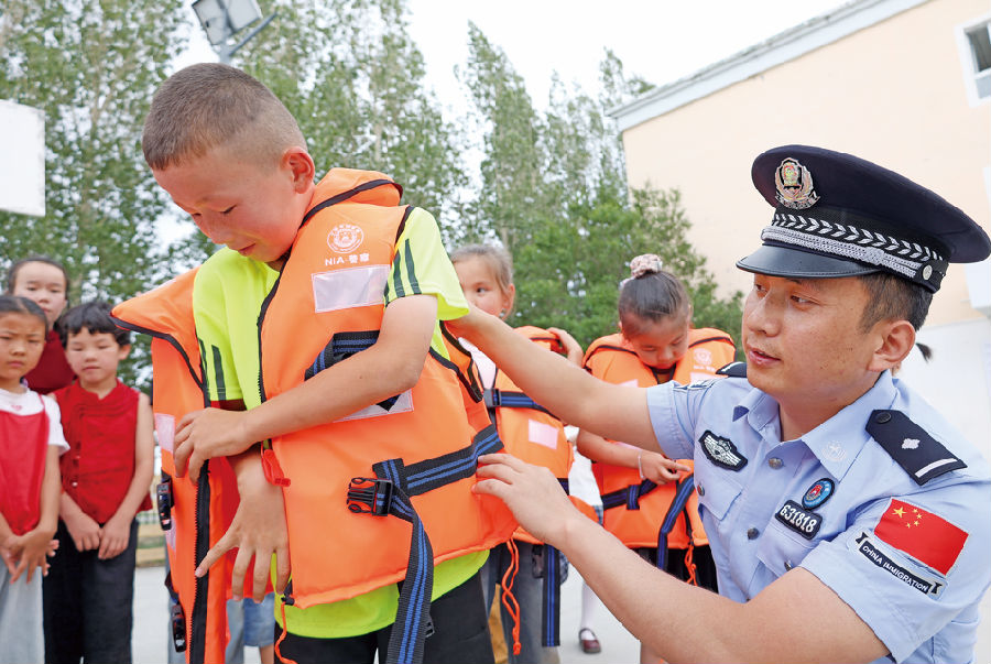 民警通过发放宣传资料、现场讲解等方式,向家长和孩子普及溺水危害及预防措施,增强大家的安全意识和自救互救能力。图为民警给孩子试穿救生衣。 石晓坤 摄