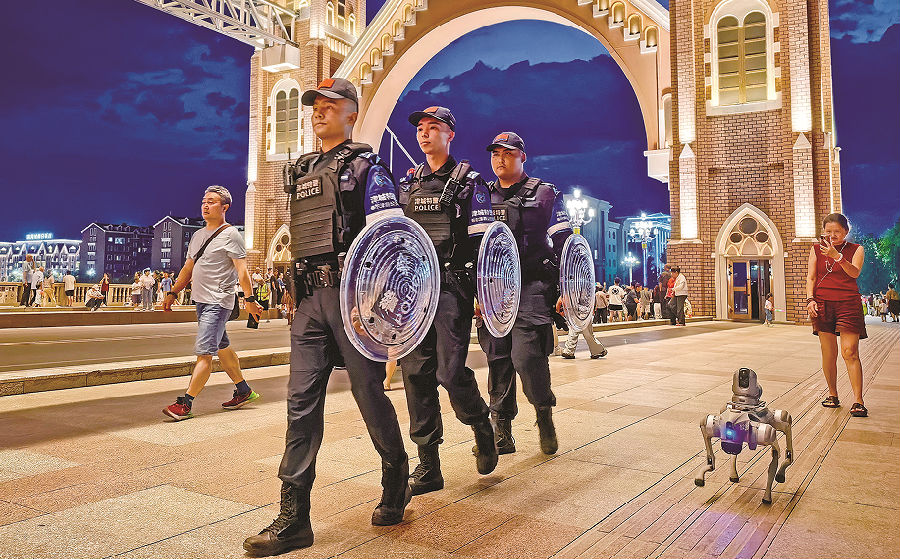 7月16日晚,布尔津县公安局民警带着机器狗在该县网红桥巡逻。