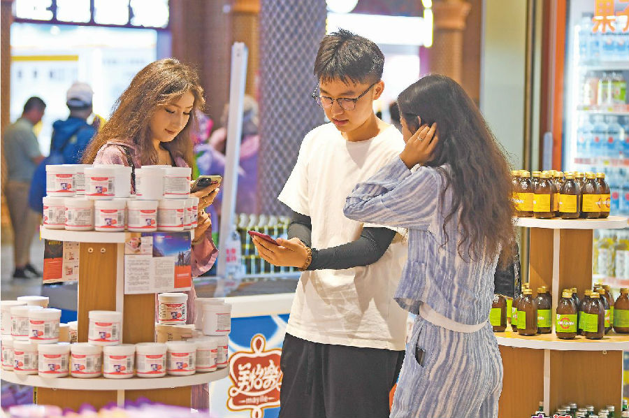 8月11日,中国—上海合作组织地方经贸合作示范区新疆商贸区首届进口商品展在乌鲁木齐大巴扎步行街“疆来城”启幕。本次展会汇聚了23个共建“一带一路”国家的近万种商品,涵盖零食、酒水、日用品等品类,为游客和市民提供跨境免税购物新体验。图为游客在展会选购护肤品。