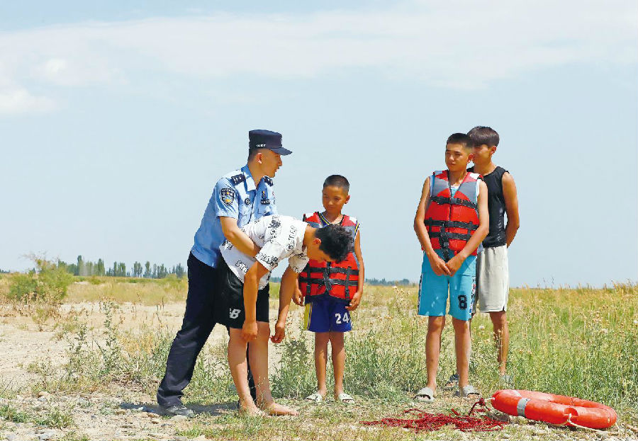 8月10日,新疆出入境边防检查总站阿克苏边境管理支队英阿瓦提边境派出所民警在辖区托什干河河道边开展暑期防溺水安全教育。
