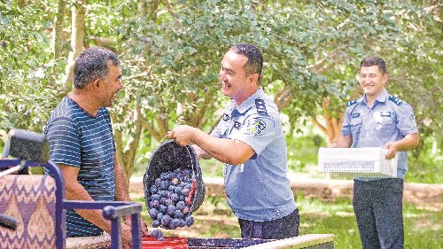 8月17日,伽师县公安局英买里镇派出所民警伊力哈木·吐尔迪(中)帮助果农把刚采摘的新梅放到三轮车上。 高坤 摄