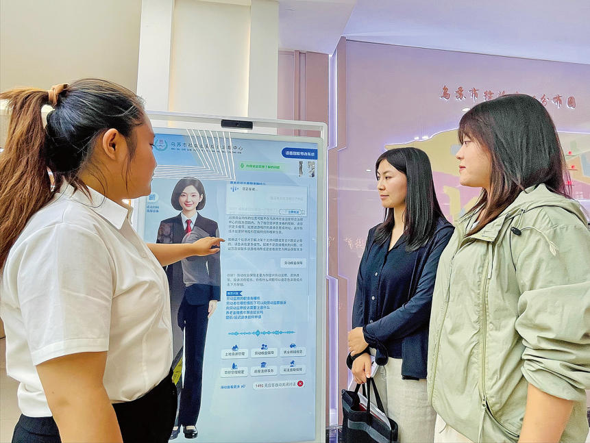 9月10日,在乌苏市社会治安综合治理中心大厅,两名办事群众通过语音智能导办系统咨询劳动权益保障相关问题。