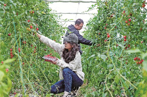 12月10日,游客在乌苏市八十四户乡兰干买里村圣女果温室大棚里采摘新鲜圣女果。
