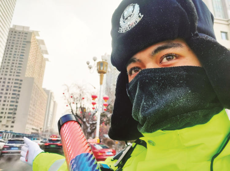 1月19日,乌鲁木齐市公安局交管支队天山区大队大小西门片区中队一名执勤辅警的眉毛、睫毛上结了一层冰霜。 石榴云/新疆法治报记者 单坤 摄