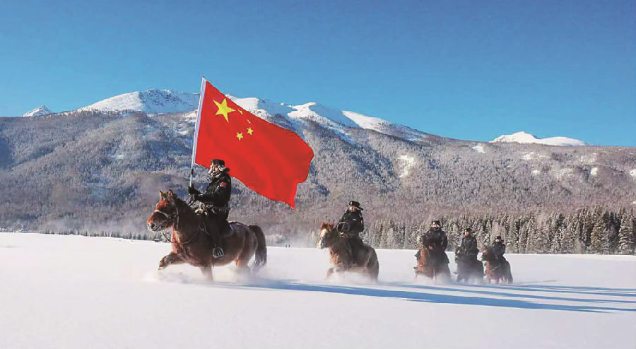1月15日,新疆出入境边防检查总站阿勒泰边境管理支队喀纳斯边境派出所民警骑马踏雪巡查。 王友波 摄