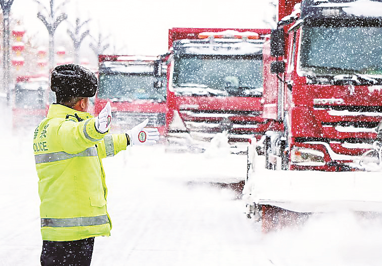 1月16日,奎屯市公安局交管大队民警指挥清雪车辆通行。 受访单位供图