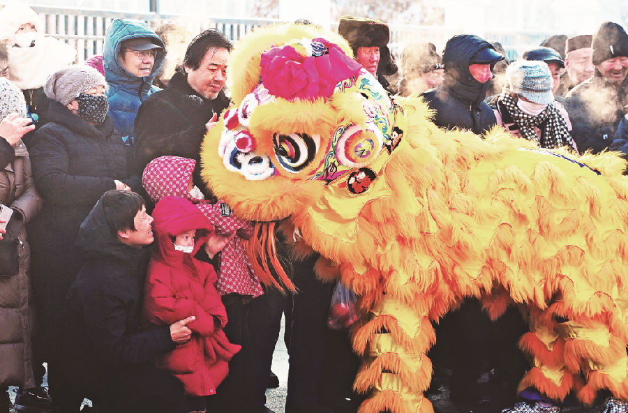 1月19日,在乌鲁木齐市米东区羊毛工镇年货节现场,舞狮演员向群众送上新年祝福。