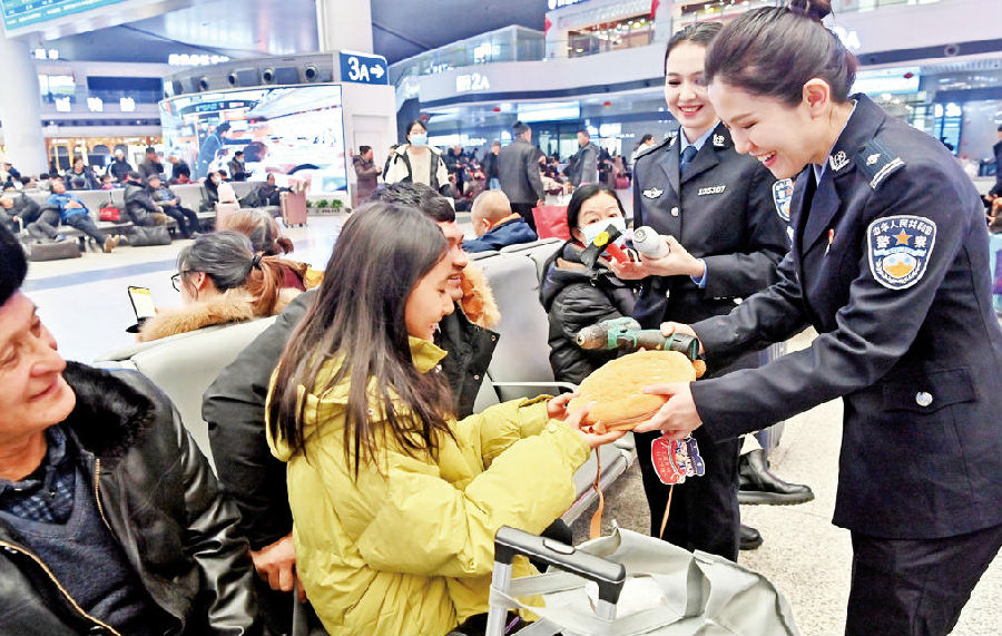 1月30日,乌鲁木齐铁路公安局乌鲁木齐公安处民警为答对问题的旅客送“警馕包”。