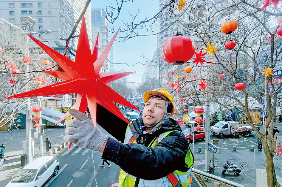 A+ | a2月3日,乌鲁木齐市天山区城市管理局(天山区行政执法局)公共照明维护管理所工作人员在中山路将彩灯悬挂在道路两旁的树上。