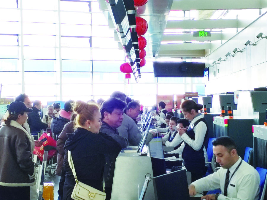 2月22日,在乌鲁木齐天山国际机场,工作人员为旅客办理值机手续。 李云 摄