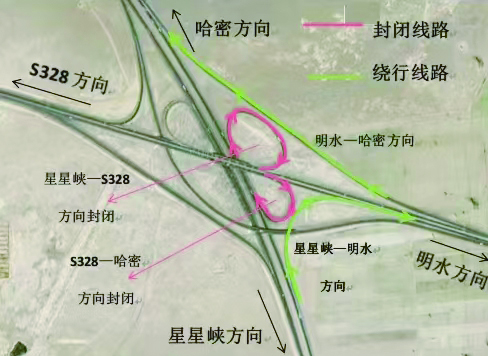 1.星星峡至S328方向下高速公路路口处封闭,车辆由星星峡向明水方向绕行,在骆驼圈子收费站处掉头通行;