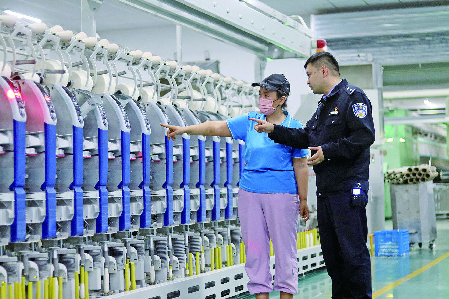 机器轰鸣作响,生产线全速运转,工人们忙而有序……3月23日,库车经济技术开发区一派热火朝天的奋斗景象。民警梁毅走进一家纺织企业,对照清单巡查安防整改情况。