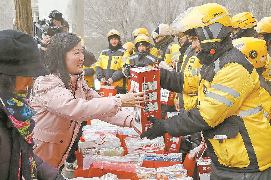12月26日,乌鲁木齐市水磨沟区总工会工作人员将礼物送到外卖骑手手中。